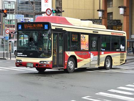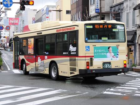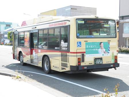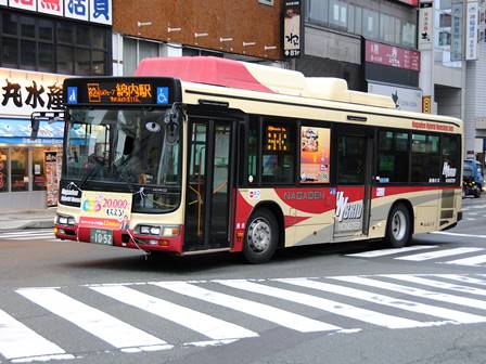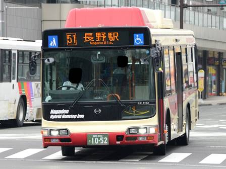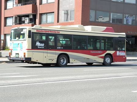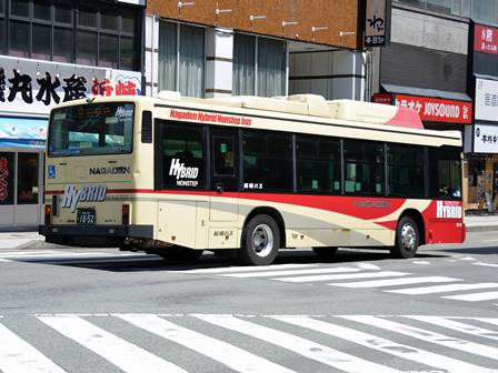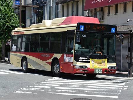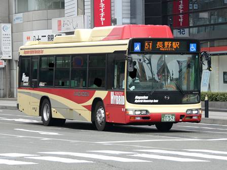 備考 | 10年10月より運行を開始した市内用のハイブリッド。10年導入分はMC後のエアループ仕様。屋根上の空調の形状やリアエンブレムが特徴(冷房は電動式)。併せてこの年式では短尺となっているのが最大の差です。この車は10月19日から運行を開始しました。導入から5年間、オリジナルを保っていましたが15年8月後半に三菱自動車の全面広告仕様となり、真っ黒になりました。この広告は短期間で、15年のうちに解除されています。17年7〜8月にリア広告が入りました。隣番の1051号車と共通です。18年10月までにヘッドライトのロービームのみLED化されています。20年1〜2月頃にリアバンパーが黒色化されました。22年5月までにリアラッピングが解除されていますが詳細時期不明。22年6月頃にリアのナンバープレートのみ新しい物に交換。22年8月頃に新たなリア広告施工。長電バスでは22年7月末から順次ベビーカー固定ベルトを取り付ける改造を行っており、完了した車両からベビーカーマークを追加されています。また、22年夏頃には戸袋広告が入っています(時系列不明)。23年4月初旬頃に路線バス全車両を対象としリアパネル(一部車両はリア窓内)へ「ゆずってくれてありがとう」ステッカーが追加されました。23年7〜8月頃に中扉窓へ入口表記が追加されました。24年3月頃に行先表示器が部分フルカラーLED仕様に更新されています。 | |||