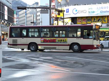 備考 | 東武バスウエストからの中古車です。ブルーリボンシティですら中古流通する時代になりました。Eg出力は不明。先に導入された2台は飯綱・飯山配属でしたが、満を持して長野配属となっています。17年6月までにリア広告が貼られています。18年12月までにヘッドライトのロービームのみLED化されています。20年夏までにリア窓広告が施工されましたが詳細時期不明。長電バスでは22年7月末から順次ベビーカー固定ベルトを取り付ける改造を行っており、完了した車両からベビーカーマークを追加されています。23年5月になってもリアのゆずってくれてありがとうステッカーが貼られていません(大半の路線車両が4月上旬に貼り付け完了)。24年までにリア広告が解除されていますが詳細時期不明。 | |||