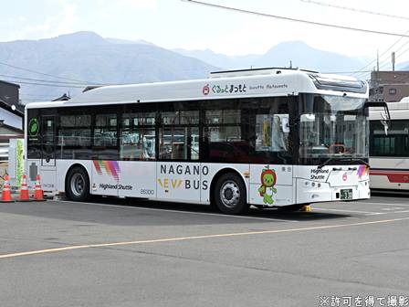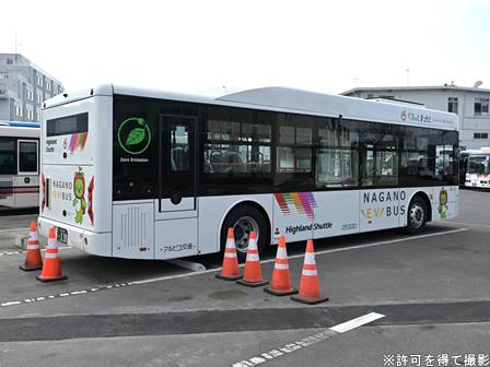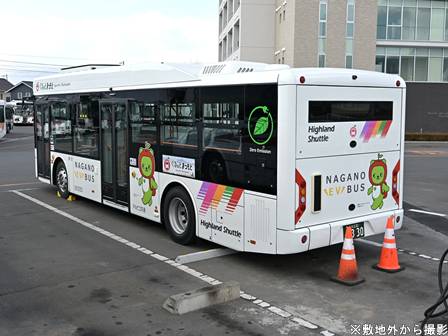 | 備考 | 26年2月に導入されたアルピコ初となる大型EV。アルファバスジャパンが販売するECITY L10 2.0です。全長10.5m、全幅2.49m、全高3.15mの車体で、中扉以降にはディーゼル車よりは小さなステップがある現実的な仕様となります。向かい合い座席もありません。製造は中国で、バッテリーセルのみPanasonicとの事です。側面に描かれるNAGANO EV BUSのロゴは千曲バスの同型車にも貼られている事から、県主導で導入が行われたのでしょうか? このロゴの兼ね合いで側面のHighland Shuttleのロゴが1段で車体裾に配置されるという初の事例にもなっています。また、前後のGIロゴにはEasy Step-inがなく、車椅子マーク・ベビーカーマークも貼られていません。 | |||||