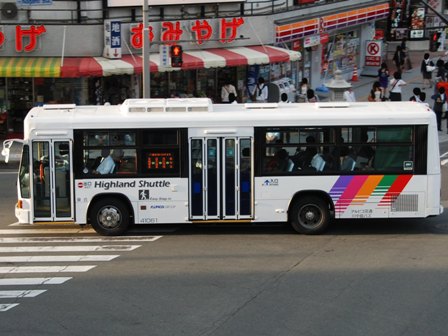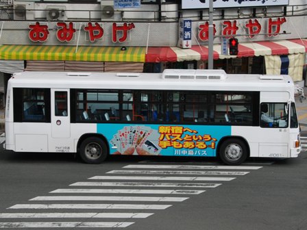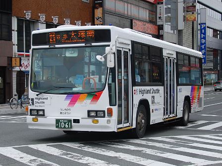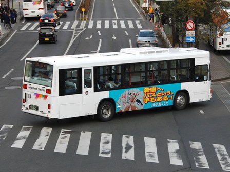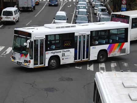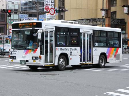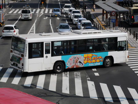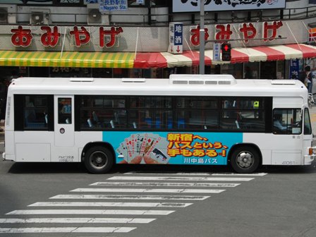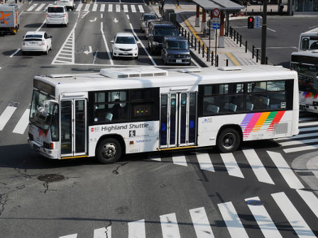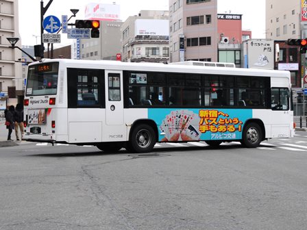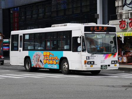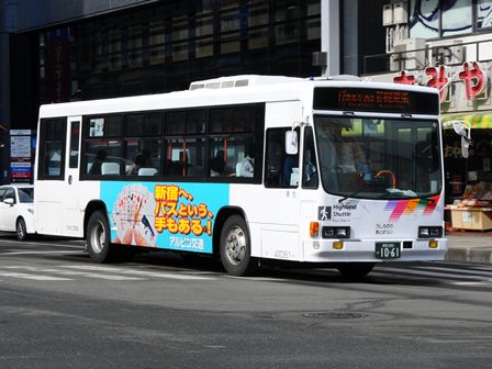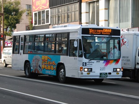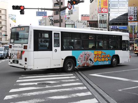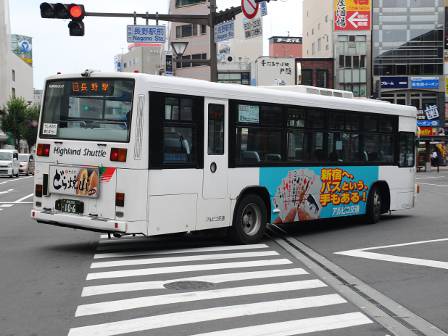 | 備考 | 10年の山陽からの転入車です。ワンステなので窓が大きく開放的です。エンジンは前後扉仕様と同じく高出力タイプ。10年12月26日に運用開始しました。当初より非公式側には高速バス広告が入っています。松電のHIMR車に入っているのと同様のタイプで、このタイプの広告は長野市内初登場となります。また、「うしろのり あとばらい」表示はこれまでのプレート式ではなくステッカーとなっています。このグループは液晶式の運賃表示器を装備しています。11年12月〜12年1月頃の間にフロントガラス下中央部の手すり2個が撤去され、12年2月中旬〜3月前半のうちにNBAマークが入りました。16年2月までにリア広告枠が設置されました。16年3月に入り、川中島バス社名が消されてアルピコ交通社名1段表記になっています(他にも多数の車両が同様の変更を受けていますが、それらより1ヶ月ほど先行)。17年末か18年初旬にヘッドライトのロービームのみLED化されています。19年4月には長野支社のほぼ全ての路線車両にNBAマークが貼られましたが、この車は元々あったものを剥がして新たな場所に貼られています。同年8月後半に定員表示が掲出されました。20年春にアルピコ交通100周年ステッカーが貼られました。また時期不明ですがリア窓広告が貼られています。22年5月頃に引退。 | |||||