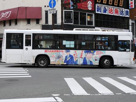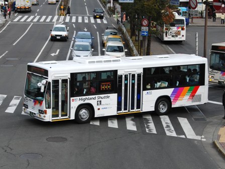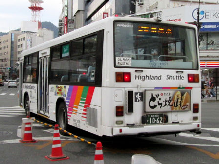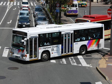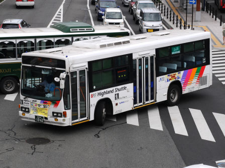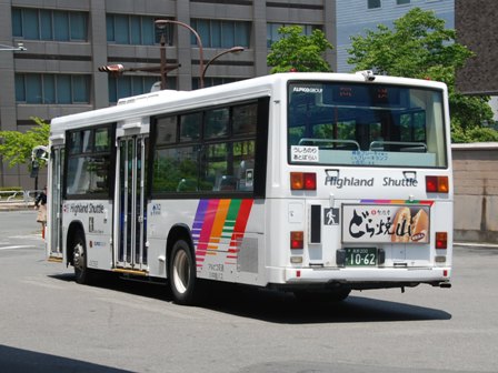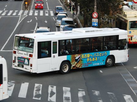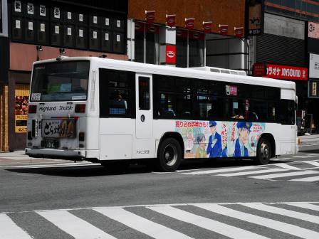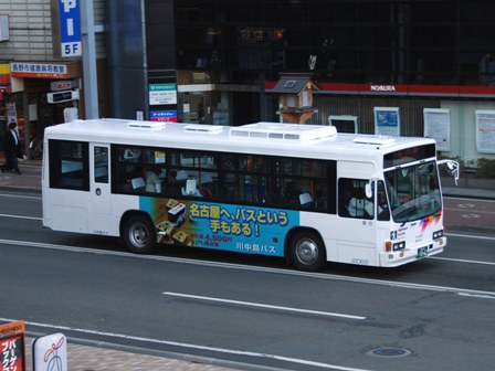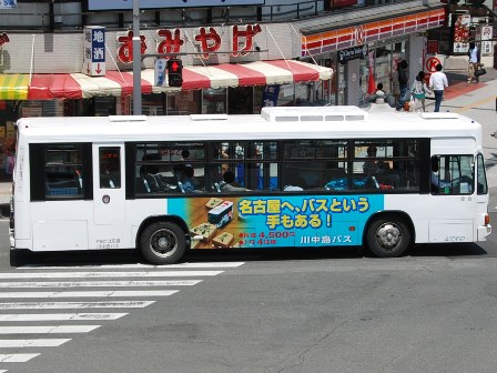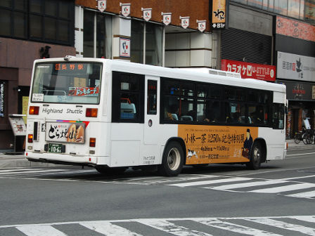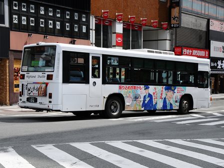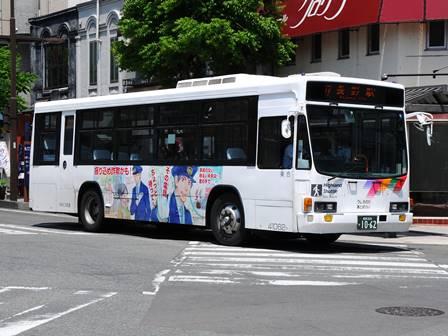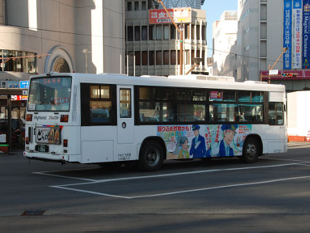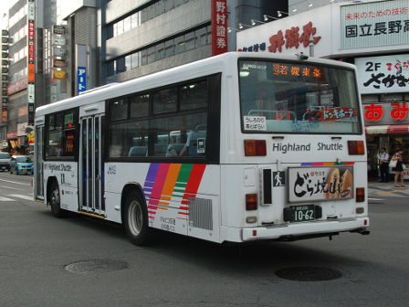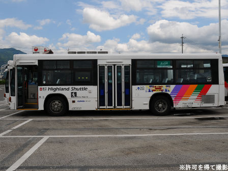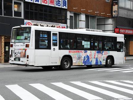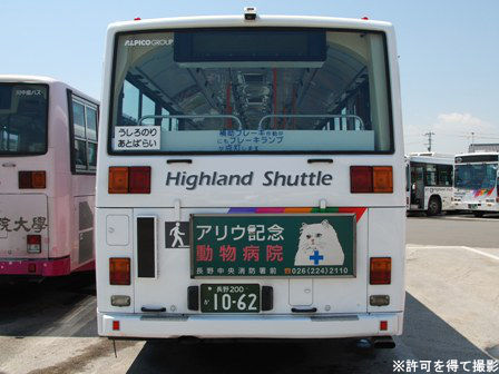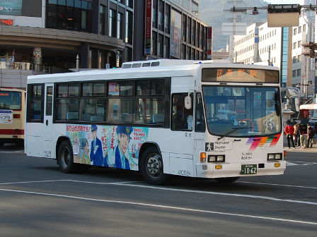 | 備考 | 10年の山陽からの転入車です。ワンステなので窓が大きく開放的です。エンジンは前後扉仕様と同じく高出力タイプ。10年12月26日に運用開始しました。当初より非公式側には高速バス広告が入っています。松電のHIMR車に入っているのと同様のタイプで、このタイプの広告は長野市内初登場となります。また、「うしろのり あとばらい」表示はこれまでのプレート式ではなくステッカーとなっています。12年2月後半にNBAマークが入りました。 13年4月頃に小林一茶記念館の広告が施されました。13年12月頃からは長野県警広告になりました。14年には公式側にも小さい広告が入っています。16年4月に入り、川中島バス社名が消されてアルピコ交通社名1段表記になっています(他にも多数の車両が同様の変更を受けています)。17年5月頃にロービームのみLED化されています。19年4月には長野支社のほぼ全ての路線車両にNBAマークが貼られ、8月後半に定員表示が掲出されました。20年春にアルピコ交通100周年ステッカーが貼られ、22年6月頃に剥がされました。22年秋に引退。 | |||||