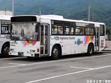 | 備考 | 97年式のブルーリボンHIMRです。11年下旬に新島々から茅野へ転属しているようです。しかし諏訪バスでは幕車で充分なため長野へ行った車両とは異なりLED化改造されていません。15年9〜10月頃に新社番化されています。17年末頃にヘッドライトのロービームのみLED化され、18年までに方向幕LED化されましたが詳細時期不明。20年春にアルピコ交通100周年ステッカーが貼られ、22年春頃に解除。23〜24年には引退している模様ですが詳細時期不明。 | |||||
