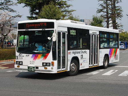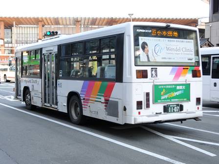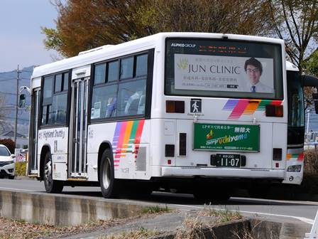 | 備考 | 11年の横浜市交からの転入車です。ワンステなので窓が大きく開放的です。11年9月下旬に運用開始した模様です。12年2〜5月のうちに非公式側広告枠が付きました。 導入時は無社番状態でしたが、12年5月に現在の社番となりました。それまでの時期は便宜上41107号車として取り扱う事とします。詳細時期不明ですが16年にロービームのみLED化されています。17年末〜18年初旬頃に車椅子マークが貼り付けられました(18/1/10には貼り付け済み)。18年10月までにリア窓広告が貼られています。19年4月に長野支社のほぼ全ての車両にNBAマークが貼られ、8月後半に定員表示が掲出されました。19年秋以降にリア窓広告が変更されていますが詳細時期不明。20年春にアルピコ交通100周年ステッカーが貼られ、22年春頃に剥がされました(詳細時期不明)。 | |||||