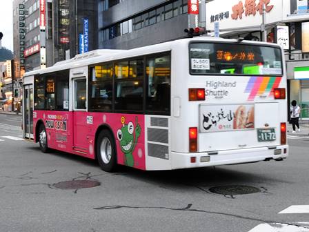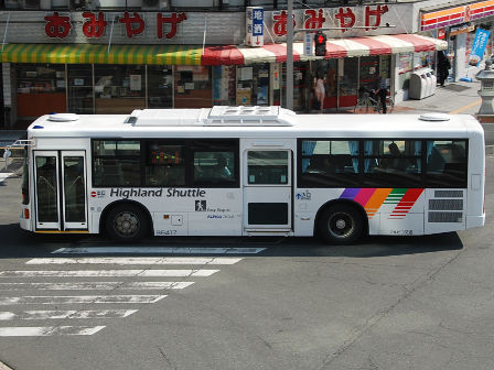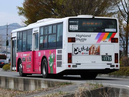 | 備考 | 12年に京王から導入された中古車です。京王でKC-代のエアロスターノンステは1999年式しか導入されていません。フォグ無しバンパーやKC-代で中扉が引戸&空調が真ん中というのも特徴です。屋根にあるフロントのマーカーランプは橙から青に交換されています。運用開始は8月前半、ラッピングなしの通常車両です。12年9月下旬に非公式側広告が設置されました。時期不明ですが15年までにリア広告が新設されています。17年初旬に公式側窓下のほぼ全長に渡るパチンコニューアサヒ広告が入りました。18年秋頃にヘッドライトのロービームのみLED化されています。19年4月に長野支社のほぼ全ての車両にNBAマークが貼られ、8月後半に定員表示が掲出されました。21年2月中旬にラッピングが解除されました。20年春にアルピコ交通100周年ステッカーが貼られました。21年2月までに公式側広告が解除となり、4年ぶりにアルピコカラーに戻りました。22年4月にアルピコ100周年ステッカーが剥がされました。24年夏に引退。 | |||||
