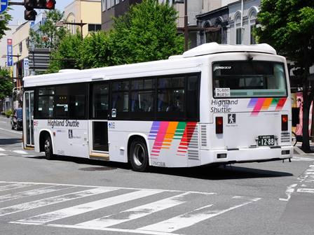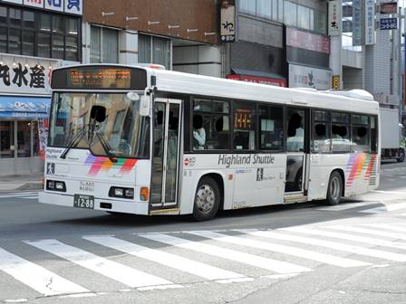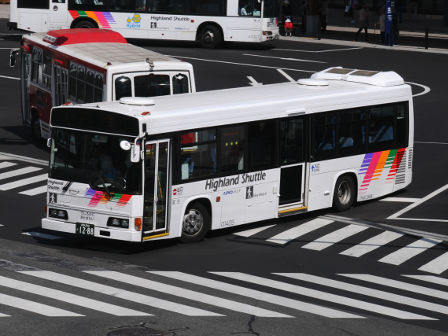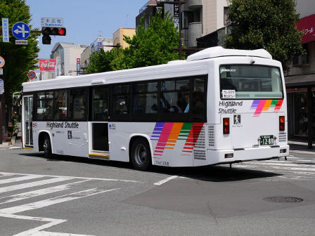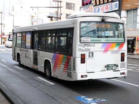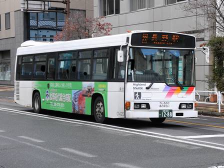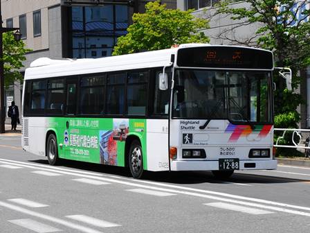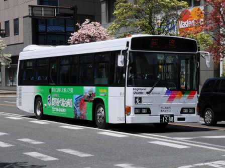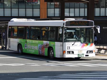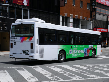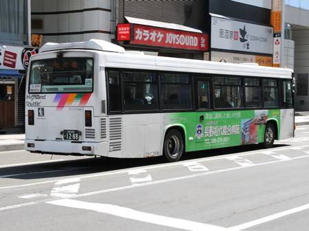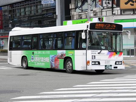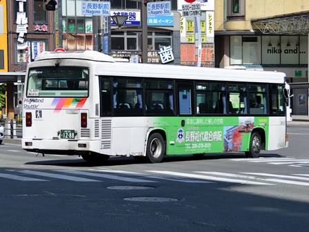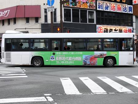 | 備考 | 14年1月頃に導入されたモヤシの01年式の中古車です。しかし最初は非公式側にダイナミックストライプが入っておらず、教習車運用でのみ使用されていました。リアのナンバープレートはオフセットされています。この車は同時期に導入された中型ロングでは標準的である2人掛け席が分割され少し前後にズラして設置されている仕様です。 その後、松代総合病院のWB間広告が施され、4月末か5月初旬に一般運用を開始しました。19年4月には長野支社のほぼ全ての車両にNBAマークが貼られ、8月後半に定員表示が掲出されました。20年春にアルピコ交通100周年ステッカーを貼り付け、22年4月に剥がされました。22年7月下旬に駒澤大学の戸袋窓広告を施工(22年冬以降に解除)。 | |||||||||||||||||||||||||||||||||||||||||||||||||
