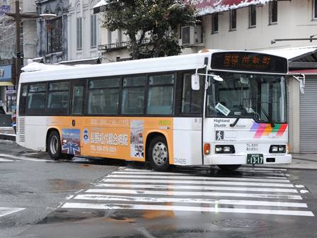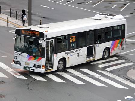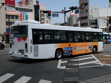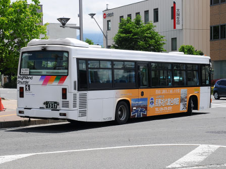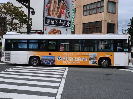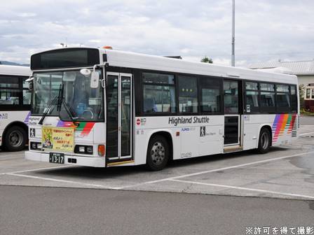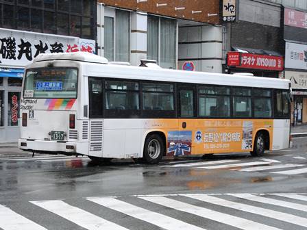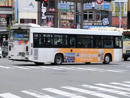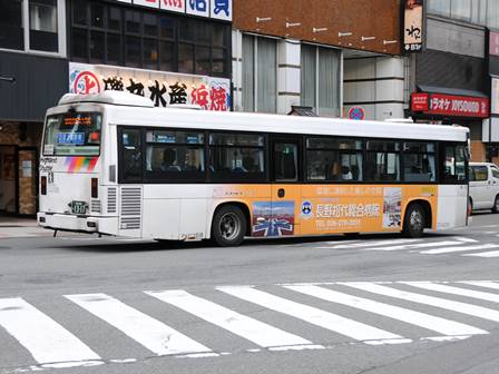 | 備考 | 14年4月頃に納車されたモヤシの01年式の中古車です。この車は同時期に導入された中型ロングでは標準的である2人掛け席が分割され少し前後にズラして設置されている仕様です。デビュー前の時点で非公式側に松代総合病院のWB間広告が施され、5月初旬から運用されています。リアのナンバープレートはオフセットされています。16年5月にロービームLED化されました。19年4月には長野支社のほぼ全ての車両にNBAマークが貼られ、8月後半に定員表示が掲出されました。20年春にアルピコ交通100周年ステッカーが貼られました。22年初旬までに新町所属車でお馴染みの芝上建設のリア窓内広告が掲出された事から、西山方面用となっているのかもしれません。22年4月にアルピコ100周年ステッカーが剥がされました。22年7月下旬に駒澤大学の戸袋窓広告を施工、23年2月頃に解除(受験日が2/4のため、それ以降に解除されたものと思われます)。 | |||||||||||||||||||||||||||||||||||||