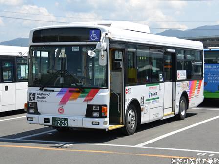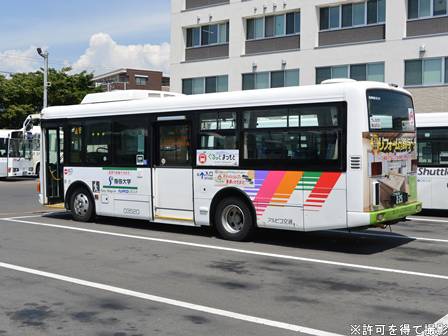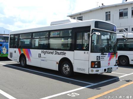 | 備考 | 17年7月に松本に導入された中古エルガミオノンステです。元事業者は松戸新京成バス。中扉窓にオレンジ色の文字が入っているのが特徴。19年春までに長野・松本所属の路線車の多くが中扉脇へのNBAマーク貼り付けを実施。19年秋以降に定員表記が貼られ、20年春にアルピコ交通100周年ステッカーが貼られました。また、20年4月に専修大学広告が貼られGIロゴ消滅(20年11月頃専修大学広告解除)。21年4月に専修大学広告が入り11月頃に解除。22年4月頃にアルピコ100周年ステッカーが剥がされ、22年4月前半のうちに専修大学広告が貼られました。21年から22年6月まで中型車限定となった上高地線代行バスでも運用されていました。22年9月末よりリアに鈴与の広告が入りました(10月初旬に03460号車にも施工)。22年10月末に専修大学広告解除。23年4月1日より松本市近郊の路線バスが松本市を運行主体とする公設民営バス「ぐるっとまつもとバス」になり、マークが貼られました。23年4月下旬に専修大学広告施工(秋に解除)。24年4月に専修大学広告施工。
