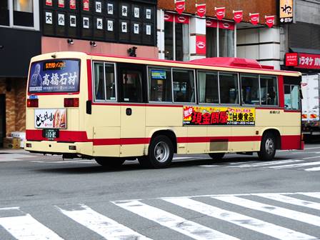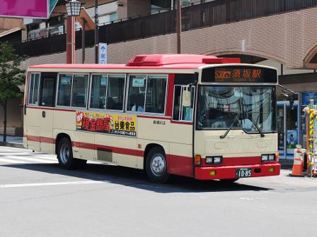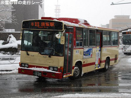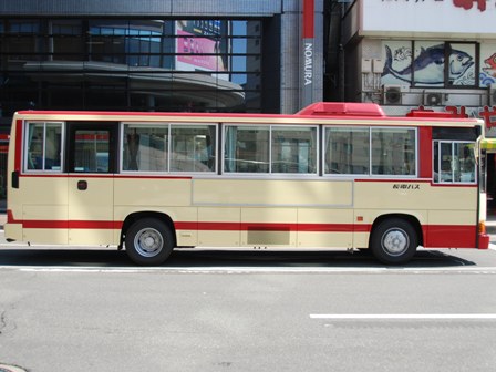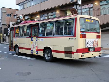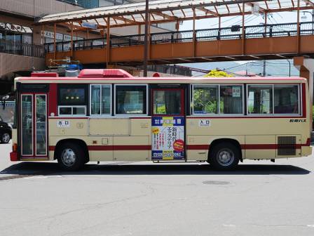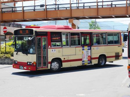 | 備考 | 名古屋市交通局から来たレインボーです。KC-代ですが銀サッシのメトロ窓のせいで非常にレトロなスタイリングとなっています。型式がRRである事からエアサス仕様のようです。飯山営業所へ配属された車と同型車で、この車は主に須坂用として長野に配置されています。時期不明ですがリア窓広告が施工されています。18年頃にヘッドライトのロービームのみLED化されました。20年のうちにリア窓広告が解除されていますが詳細時期不明。 | |||