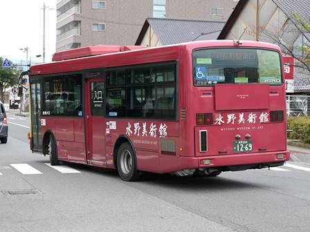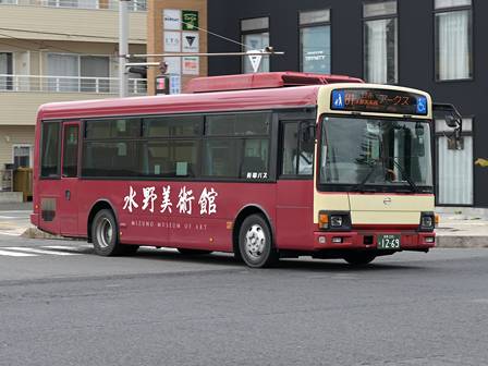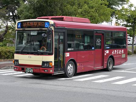 | 備考 | 13年9月に導入された車両です。レインボーIIノンステが継続的に導入されています。1268・1269号車は扉間の座席が両側ともロングシート仕様。18年12月までにヘッドライトがLEDタイプの部品にASSY交換されました。長電バスでは22年7月末から順次ベビーカー固定ベルトを取り付ける改造を行っており、完了した車両からベビーカーマークを追加されています。この車は8月に施工。23年4月初旬頃に路線バス全車両を対象としリアパネル(一部車両はリア窓内)へ「ゆずってくれてありがとう」ステッカーが追加されました。23年7月頃に中扉窓へ入口表記が追加されました。24年秋に2台目の水野美術館号になりました。 | |||