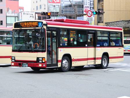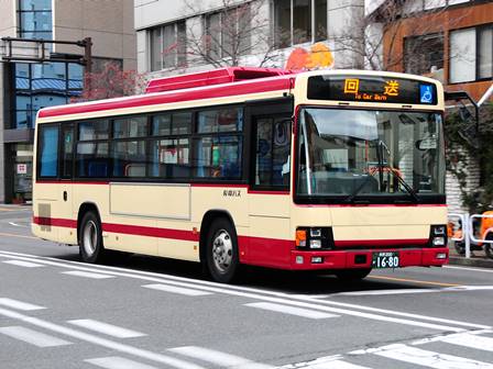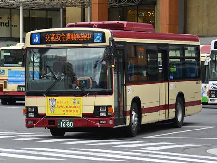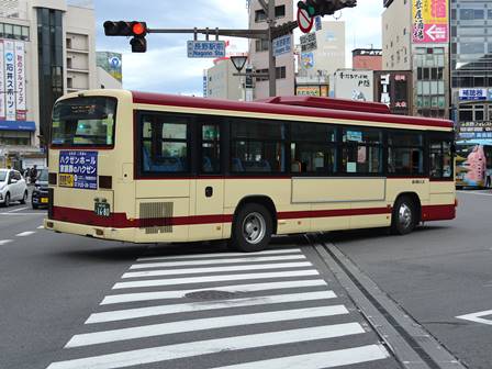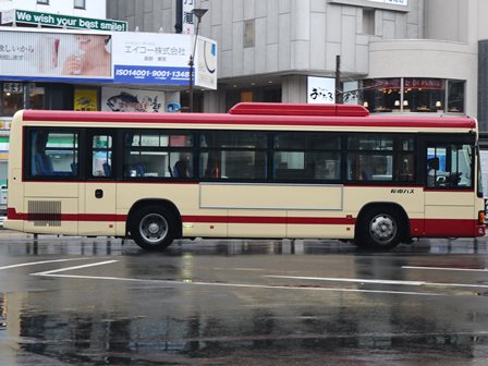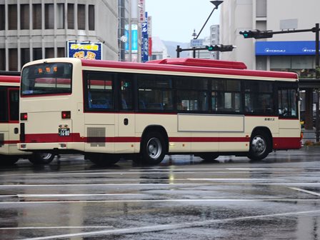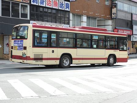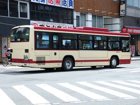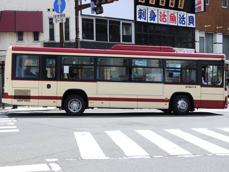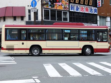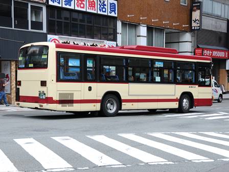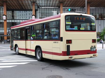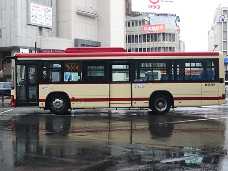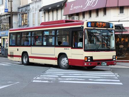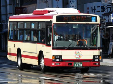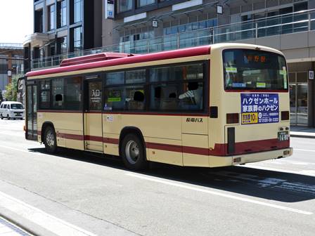 | 備考 | 18年7月下旬に長野市内に導入されたPJ-エルガ。長電バス初導入となるPJ-代の中古車で、京急バスの中古も初導入と思われます。21年12月にリア広告が入った他、クリスマスや謹賀新年のヘッドマーク装着車に選定されました。22年6月までにリア広告が解除され、同じく22年6月に導入時よりずっと後ろ上がりだったサスペンションが調整され普通の見た目になりました。長電バスでは22年7月末から順次ベビーカー固定ベルトを取り付ける改造を行っており、完了した車両からベビーカーマークを追加されています。この車は8月中旬までに施工。23年4月初旬頃に路線バス全車両を対象としリアパネル(一部車両はリア窓内)へ「ゆずってくれてありがとう」ステッカーが追加されました。また、23年春までにリア広告も貼り付け(時系列不明)。23年7〜8月頃に中扉窓へ入口表記が追加されました。 | |||