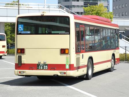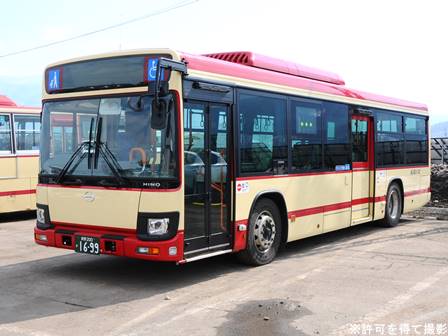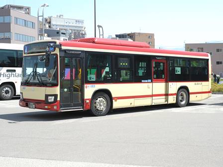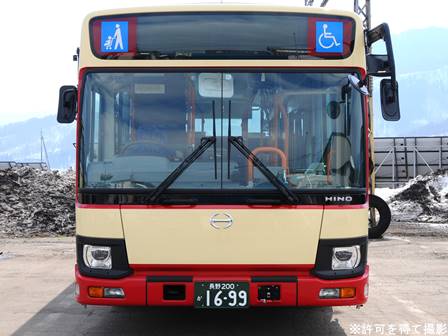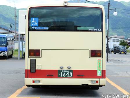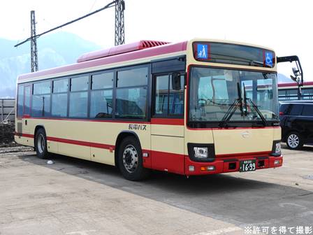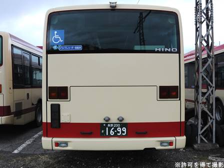 | 備考 | 18年秋に飯山に導入されたLEDヘッドランプ仕様のブルーリボン。18年11月登録。2DG-代でN尺となっています。登録は11月ですがデビューは12月です。バスラマVol.175によるとこの車は長野県所有車だそうです(公有民営方式)。23年4月初旬頃に路線バス全車両を対象としリアパネル(一部車両はリア窓内)へ「ゆずってくれてありがとう」ステッカーが追加されました。 | |||