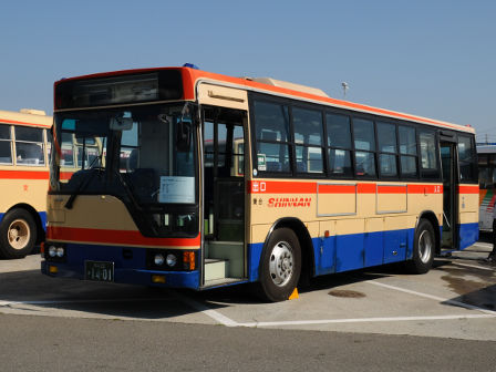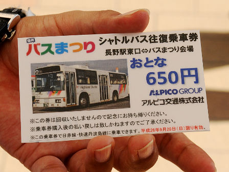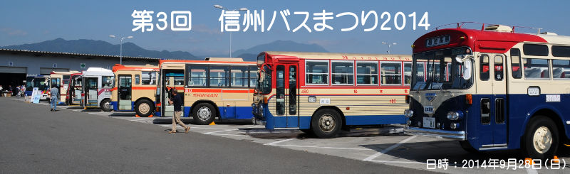 2014年9月28日、アルピコ交通長野営業所で第3回信州バスまつり2014が開催されました。バス協主催のバスまつりも3回目となります。シャトルバスは出来たばかりのユメリアパーク発着。 | シャトルバスには何やら意味あり気な掲示が。充当されたのは基本的に中古導入路線車両で、元事業者のカラーリングを模していました。1枚目の写真の7Eも横浜市交のカラーですね。 |