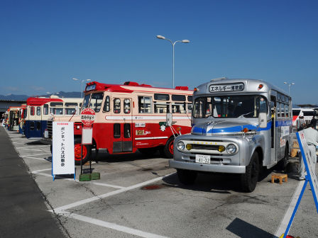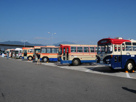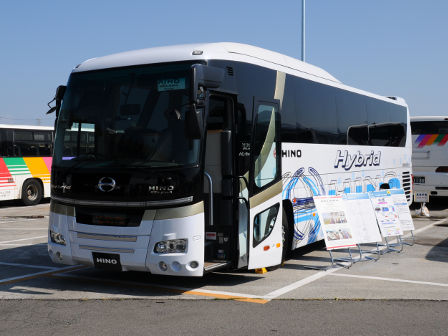 今回の個人的な最大の見所はこの車両。長野駅に発着する車両としては一番縁遠い車両の車内も見学出来て大満足でした。 | 各事業者の他、メーカーのサンプルカーも集合していました。 日野自動車はセレガハイブリッド、ふそうは新型エアロスター。 |