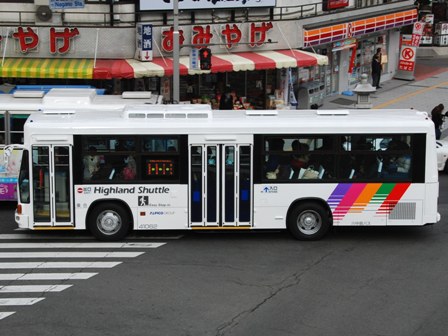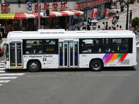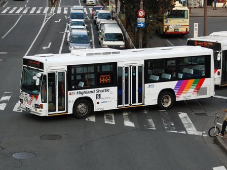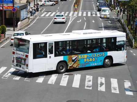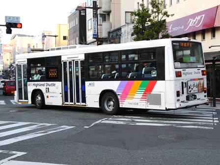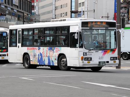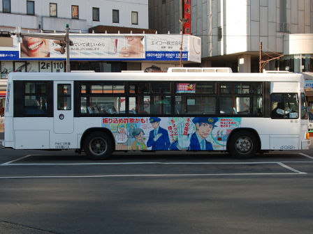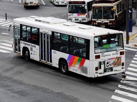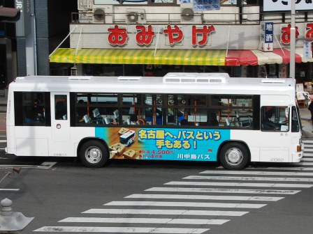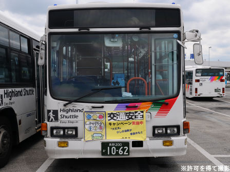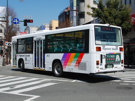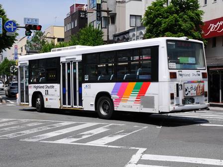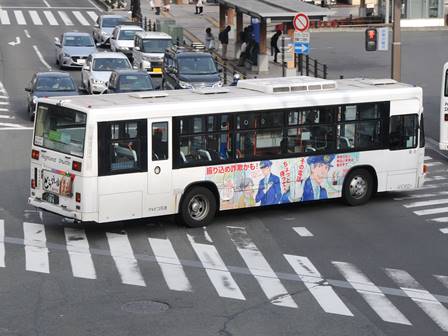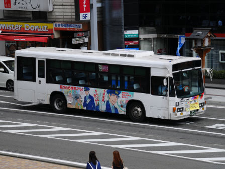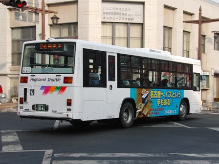 | 備考 | 10年の山陽からの転入車です。ワンステなので窓が大きく開放的です。エンジンは前後扉仕様と同じく高出力タイプ。10年12月26日に運用開始しました。当初より非公式側には高速バス広告が入っています。松電のHIMR車に入っているのと同様のタイプで、このタイプの広告は長野市内初登場となります。また、「うしろのり あとばらい」表示はこれまでのプレート式ではなくステッカーとなっています。12年2月後半にNBAマークが入りました。 13年4月頃に小林一茶記念館の広告が施されました。13年12月頃からは長野県警広告になりました。14年には公式側にも小さい広告が入っています。16年4月に入り、川中島バス社名が消されてアルピコ交通社名1段表記になっています(他にも多数の車両が同様の変更を受けています)。17年5月頃にロービームのみLED化されています。19年4月には長野支社のほぼ全ての路線車両にNBAマークが貼られ、8月後半に定員表示が掲出されました。20年春にアルピコ交通100周年ステッカーが貼られ、22年6月頃に剥がされました。22年秋に引退。 | |||||