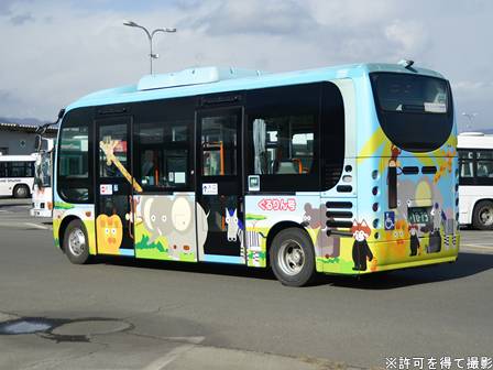 | 備考 | 11年4月18日から運行開始した篠ノ井ぐるりん号用に導入されました。土休日には茶臼山動物園と篠ノ井駅を結ぶ「Zooぐる」にも充当され、こちらは篠ノ井ぐるりん号より2日先行して運行開始しています(4/16〜)。篠ノ井ぐるりん号は当初、実証実験運行だったため、実験期間後も路線が存続されるかどうかは成績次第でした。カラーリングはぐるりん号の水色を基調としていますが、動物や二次元キャラクターなどが配された特別仕様となっています。長野市の保有車両ですが、アルピコ交通発足後はコミュニティバスもアルピコ社番付番となっているため、この車は導入当初より40000番台社番が付いている模様です。時期不明ですが16年までに広告が撤去されています。17年には部分的にラッピングをやり直している模様で、従来は色の差が無かった場所で色が変わっている場所があります。19年春にNBAマークが貼られたものと思われます。21年までにリア窓下に広告が入り、更にリア上部のラッピングがやり直されているように見受けられますが詳細時期・内容共に不明。21年5月には県道戸隠線のルート上の工事のため大型路線バスが走行出来なくなった事から、この車が当該区間を含む狭隘な茂菅〜影山間を担当(大型車は別ルートで迂回運行し接続)。一部便では長野市中心部まで足を延ばしていました(延長区間のみでの乗降は不可)。詳細時期不明ですが24年までに黄色いリア広告が解除されています。 | |||||