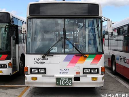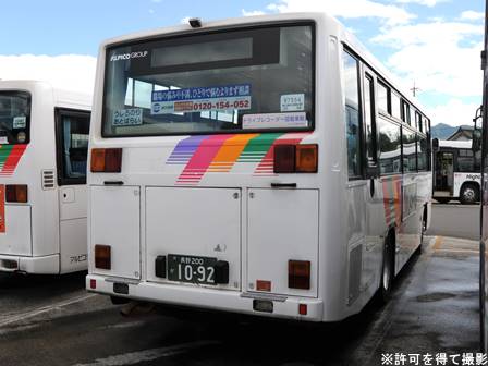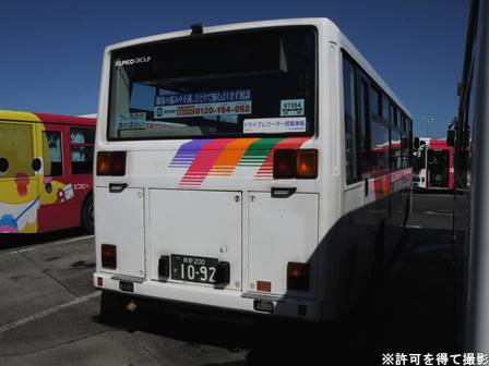 | 備考 | 11年の中古導入車です。11年7月下旬に運用開始した模様です。当初はしろりんに入ったり日によって運用が違ったりしていて広範囲の予備車的位置付けになっていたようです。座席につく取っ手がオレンジ色なのも特徴的です。 導入時は無社番状態でしたが、12年5月に現在の社番となりました。それまでの時期は便宜上41092号車として取り扱う事とします。 12年7月末か8月初旬にアルピコ自工のリア広告が入りました。16年4月に入り、川中島バス社名が消されてアルピコ交通社名1段表記になっています(他にも多数の車両が同様の変更を受けています)。16年12月中旬にEasy Step-inのピクトグラムが撤去されています。17年8月までにリア広告が撤去されました。18年夏までに非公式側に広告枠が設置されましたが詳細時期不明。19年4月に専修大学広告が入りましたが、NBAマークは貼られていません。同年8月後半に定員表示が掲出され、11月に専修大学広告が剥がされました。その跡地にNBAマークが貼られています。20年4月に専修大学広告が貼られ、同時期にアルピコ交通100周年ステッカーも貼られています(専修大学広告は20年11月頃解除)。21年4月も専修大学広告が貼られましたが、21年11月までに戸袋窓広告が専修大学から駒澤大学に変更されました。22年2月の入試日前後で解除されたものと思われます。22年4月にアルピコ100周年ステッカー解除。22年9月までにヘッドライトのロービームがバルブ交換によりLED化されました(詳細時期不明)。24年4月下旬に専修大学広告を施工。24年夏までに引退(専修大学広告は他車へ移っているものと思われます)。