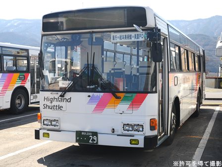 | 備考 | 99年式のブルーリボンHIMRです。11年の茅野移籍までずっと新島々所属だったので方向幕のLED化改造がされていない状態で茅野転属。側面方向幕はALPICO固定なものの残されています。 12年10月から短期間、オレンジリボンラッピングとなっています。すぐに剥がされた後、14〜15年頃にJAの非公式側WB間広告施工。公式側がダブル「アルピコ交通」仕様になってしまっています。15年10月頃に新社番化。16年下旬〜17年上旬の間に前面方向幕LED化を受けています。リアは増設無し、側面は白幕固定。また、17年2月までにWB間広告が撤去されています。17年春以降にヘッドライトのロービームのみLED化されています。19年春に各営業所の路線車へのNBAマーク貼り付けを実施。20年春にアルピコ交通100周年ステッカーが貼られました。20年8月の貸切ツアーに使用され、20年のうちに引退したものと思われます。 | |||||