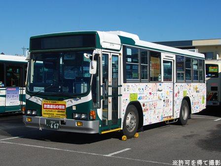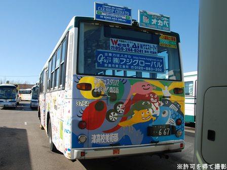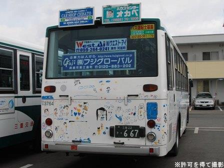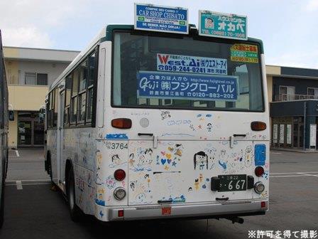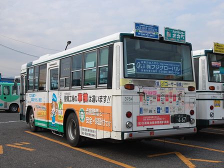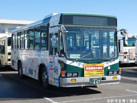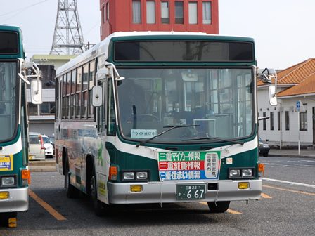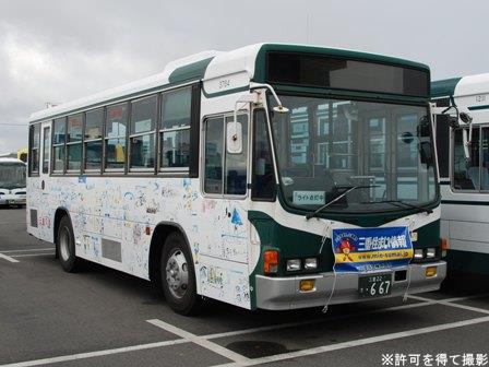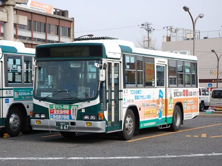 備考 | キュービック車体のLT。中勢営業所に所属しています。11年頃にお絵かきバスになっています。絵がマスで分かれていなかったり、内容等から幼稚園や保育園等でのイベントで使用されたのかもしれません。12年の新町フェスタでもお絵かきバスとなり、連チャンで2つのお絵かきバスになった珍しい車です。14年秋に運賃箱が外されてシャトル限定になったという情報有。15年のうちには引退しているものとみられます。 |