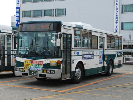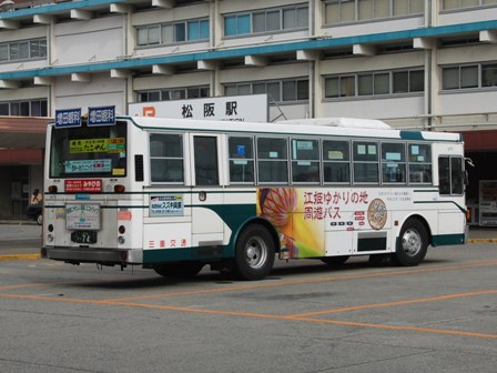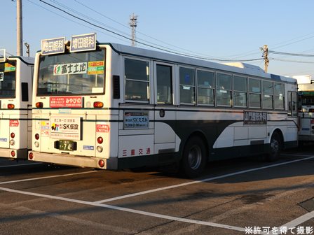 備考 | 7E車体のLV。松阪営業所に所属しています。非公式側にWB間パートラッピングが施されていましたが時期不明のうちに解除されています。15年のうちにデイライト設置、16年にはヘッドライトのロービームのみLED化されています。三重交通本体では最も若番のLED化車両とみられます。17年9月までに引退しました。 |