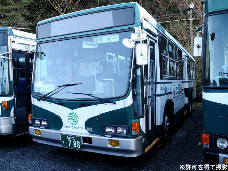 備考 | キュービック車体のLV。前面には社紋の代わりにアイドリングストップバスのマークが表示されています。11〜12年に北勢事業所から伊賀へ転属し、同時期にLED化改造も行われた模様です。14年頃には志摩へ転属しています。16年に正面の社番が貼り付けられました。17年9月までに引退しました。 |