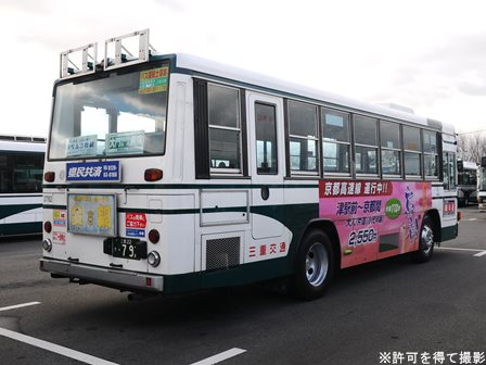 備考 | キュービック車体のLT。中勢営業所に所属しています。非公式側のみ津―京都線のWB間パートラッピングが施されています。14年後半から15年のうちにデイライトが設置されました。16年春に中勢営業所所属車ほぼ全てに前面社番表示が貼られました。17年のうちに引退しています。 |