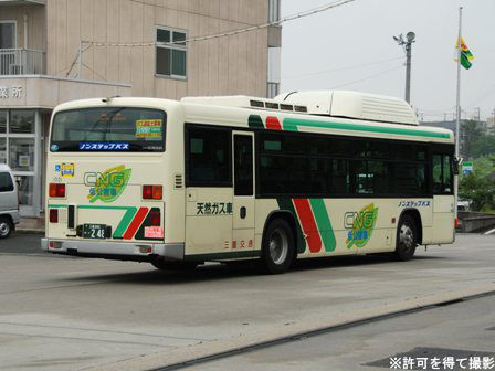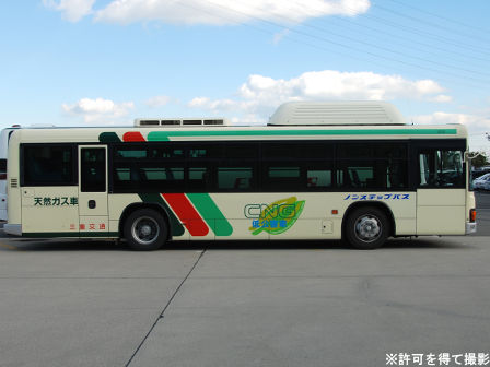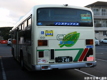 備考 | エルガtype-AをベースにCNG仕様にした低公害車両は四日市に集中配置。ノンステ新塗装になっています。全部で6台導入され、この車がトップナンバーです。CNG車は車庫で燃料補給出来ないため、運用範囲等は限定される模様。15年のうちにデイライトが設置されています。19年秋までに引退しています。尚、1001という社番は20年導入のエルガデュオで再利用されています。 |