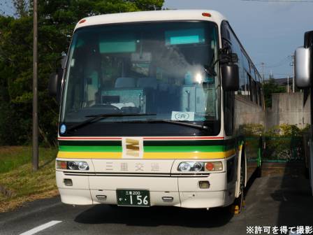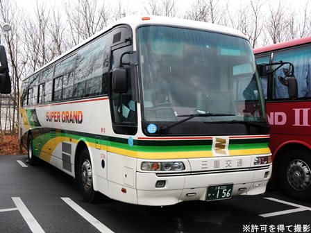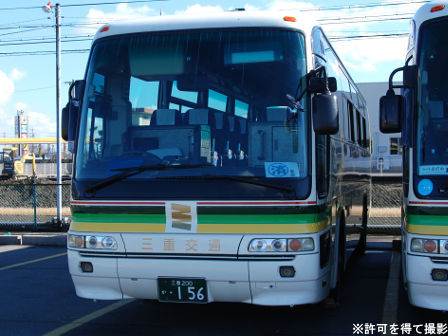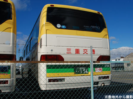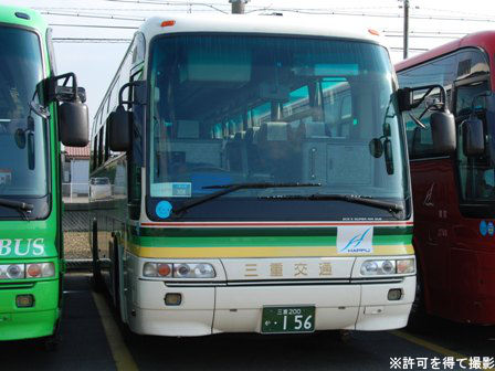 備考 | 八風バスが導入したエアロバスです。車名表記は「三重交通」ですがフロント社紋とアルファベットは八風バス仕様となっていました。12〜13年のうちにリア広告やロゴ類が撤去されている他、フロントも八風バス社紋から三重交通社紋に変更されました。 15年までに南部観光に転属し、15年のうちにデイライトが設置されています。17年に入り中部観光に転属。中部観光で行灯レスエアロバスはレア(17/1/3撮影時点では所属表記はまだ南部観光のため、南部観光に分類)。 | |||