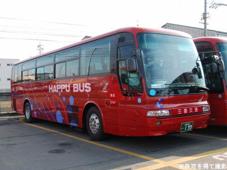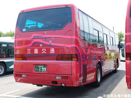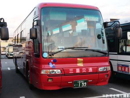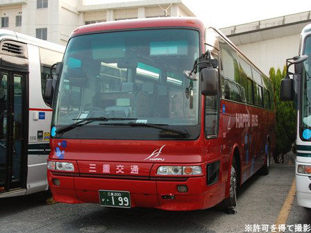 備考 | 真っ赤なエアロバスです。元々は八風バスの所属車でしたが、09年までに三交本体(桑名)に移籍した模様。八風バスの真っ赤なカラーリングがそのままになっており、移籍当時は「HAPPU BUS」ロゴもそのまま残ったダブルネーム状態でした。時期不明ですが15年までに中勢転属し、社紋が変更され、HAPPU BUSロゴがSUPER GRAND IIに変更されており、15年のうちにデイライトも設置されています。17年3月頃に伊勢へ転属し度会スクールで運用中。伊勢エリアで初の八風バス貸切カラーの可能性有。22年前半に引退しました。 | |||
