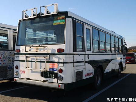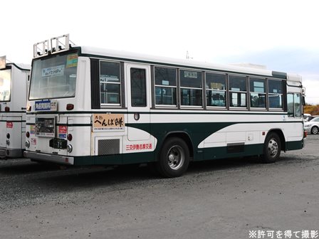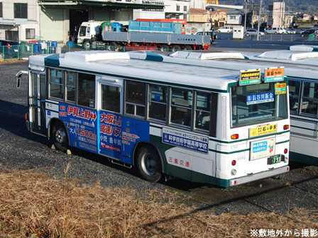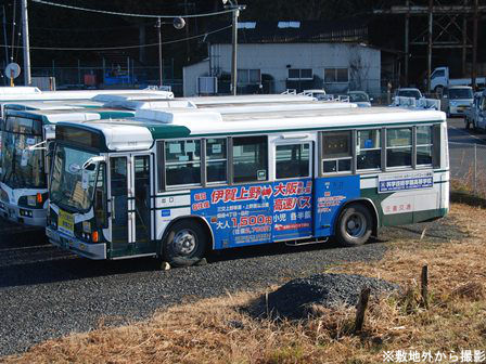 備考 | キュービック車体のLT。以前は伊賀営業所に所属しており、公式側に伊賀―大阪線のWB間パートラッピングが施されていました。15年までに三交伊勢志摩交通に転属し、時期の相関は不明ですが広告が解除されています。15年にはデイライトが設置され、ヘッドライト(ロービーム)のLED化も行われています。17年秋までに前面にライト点灯の大きなステッカーが貼られましたが、よりによって以前の社紋をバッチリ隠す位置に貼られています(笑) しかし、同年冬までに貼付位置が変わりました。23年春までに引退しました。 |